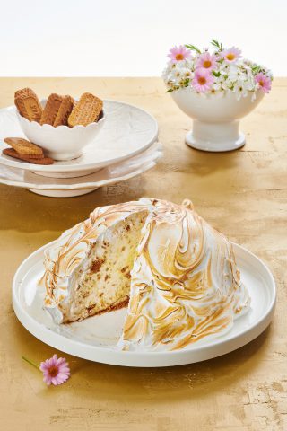 מקלפים את הניילון ומזלפים פסי מרנג לכיסוי (בלי שפיצים כי הם יישרפו).