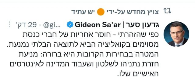 יש לציין שעוד קודם לכן ביש עתיד שתפו מחדש את הציוץ של גדעון סער המזהיר מפני הליכה לבחירות. מה שמשדר אולי את המחנה ממנו הורכבה הממשלה אל מול מחנה נתניהו.