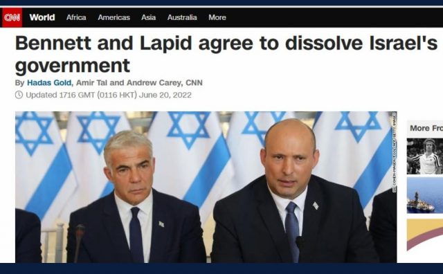 "בנט ולפיד סיכמו לפזר את הממשלה הישראלית, בדרך למערכת הבחירות החמישית של ישראל תוך 3 שנים" נכתב בכותרת של אתר CNN. "במידה והחוק לפיזור הכנסת יעבור, לפיד יחליף את בנט בראשות הממשלה – ובין השאר יהיה המנהיג הישראלי בביקור המתוכנן של הנשיא ג'ו ביידן בחודש הבא".
