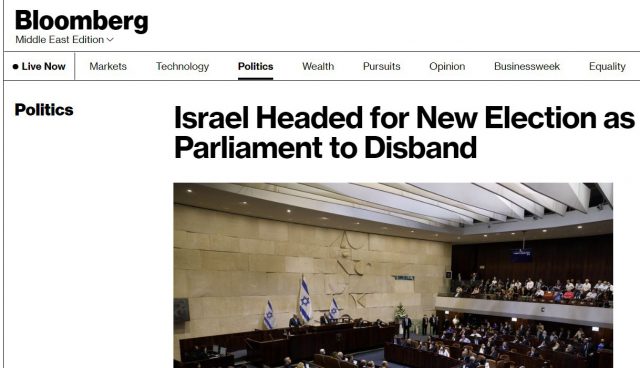 ברשת בלומברג נאמר כי "ישראל בדרך לבחירות חדשות אחרי שהקואליציה השברירית קרסה. הממשלה, שהוקמה לפני שנה, התפרקה בגלל קרבות פנימיים, בזמן שבנימין נתניהו מבטיח להיות זה שיקים את הממשלה הבאה בישראל".