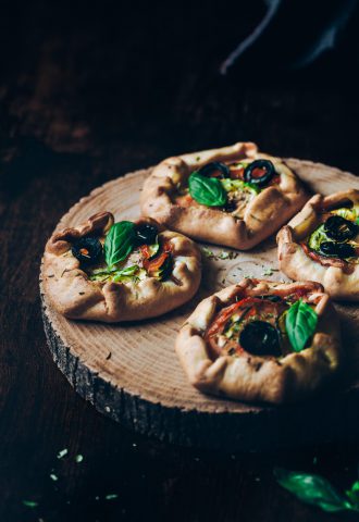 מניחים אותם על תבנית תנור מרופדת בנייר אפייה, ומחוררים את בסיס הגאלטים מספר פעמים בעזרת מזלג. מוסיפים מעט רוטב עגבניות מעל, גבינה טבעונית, פרוסות קישואים, עגבנייה וזיתים שחורים.