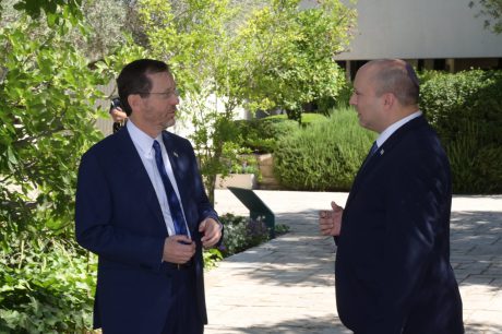 נשיא המדינה יצחק הרצוג ורעייתו מיכל נועדו היום, לראשונה עם ראש הממשלה הנכנס יאיר לפיד ורעייתו ליהיא, בבית הנשיא בירושלים.