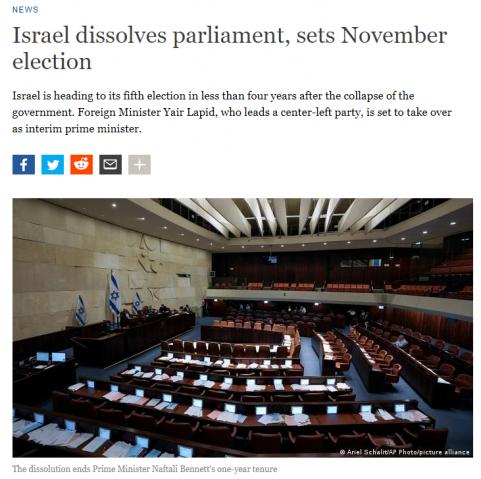 באתר הגרמני DW נכתב כי "ישראל מקיימת את הבחירות החמישיות תוך פחות מחמש שנים, לאחר שהממשלה התמוטטה. שר החוץ יאיר לפיד, שמנהיג את מפלגת המרכז-שמאל, צפוי להפוך לראש ממשלת המעבר".