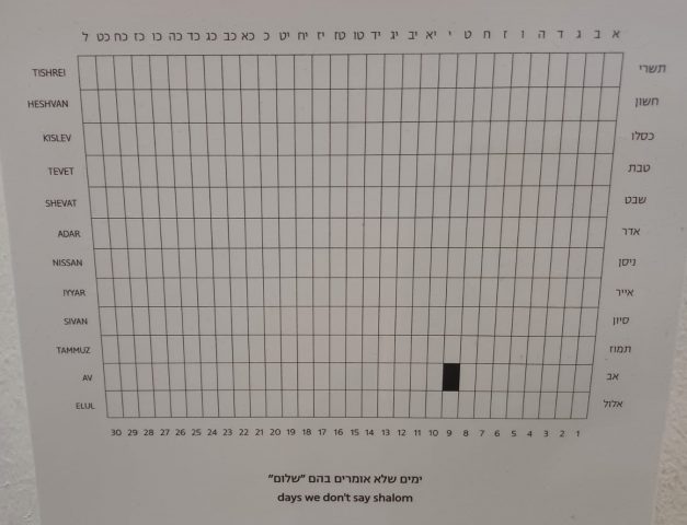 מיצג נוסף שעוסק בזמן ובעולם היהודי, הוא הפרויקט של דב אברמסון, שמציג את הפרקטיקה היומיומית של לוח השנה היהודי. על גבי סדרת תמונות, מסומנים תחת כותרות שונות ימים חשובים בלוח השנה, ללא נימוק או הרחבה עליהם. יום כיפור וספירת העומר מסומנים שניהם תחת הכותרת "ימים שאסור לשמוע בהם מוזיקה"- אך בלי שלמתבונן יש את היכולת להבין שמדובר ביום אחד קדוש מחד, ובתקופה שהונחלו בה מנהגים מאוחרים מאידך.