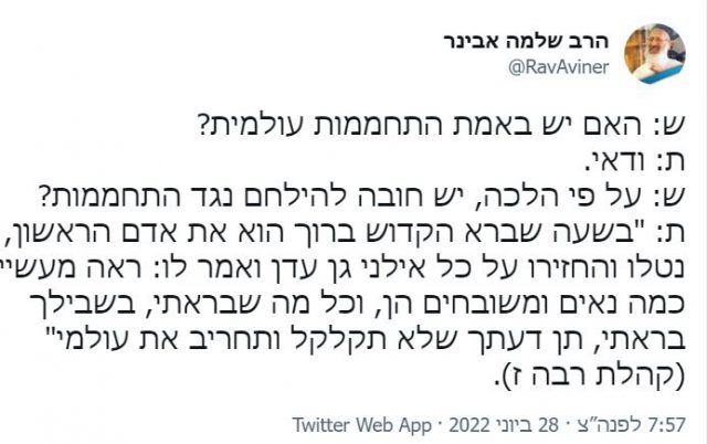 אחרי שקראתי את תשובתו של הרב שלמה אבינר בעניין 'משבר האקלים', נזכרתי במכתב אשר נשלח לפני למעלה מחצי שנה, ובין חותמיו היו הרבנים הרב אבינר, הרב אריאל, הרב שרלו, הרב סתיו ועוד, אל ראשי המדינה והמערכת הפוליטית בדבר הדחיפות 'להציל את כדור הארץ'. נזכרתי ונעצבתי באחת. מפני שזו איננה פעם ראשונה בה מתייחסים רבנים אל תחומי דעת לא להם, במיוחד כאשר עניין האקלים הפך להיות לנושא בתחום הפוליטיקה העולמית בכלל והפנים ארצית בפרט.