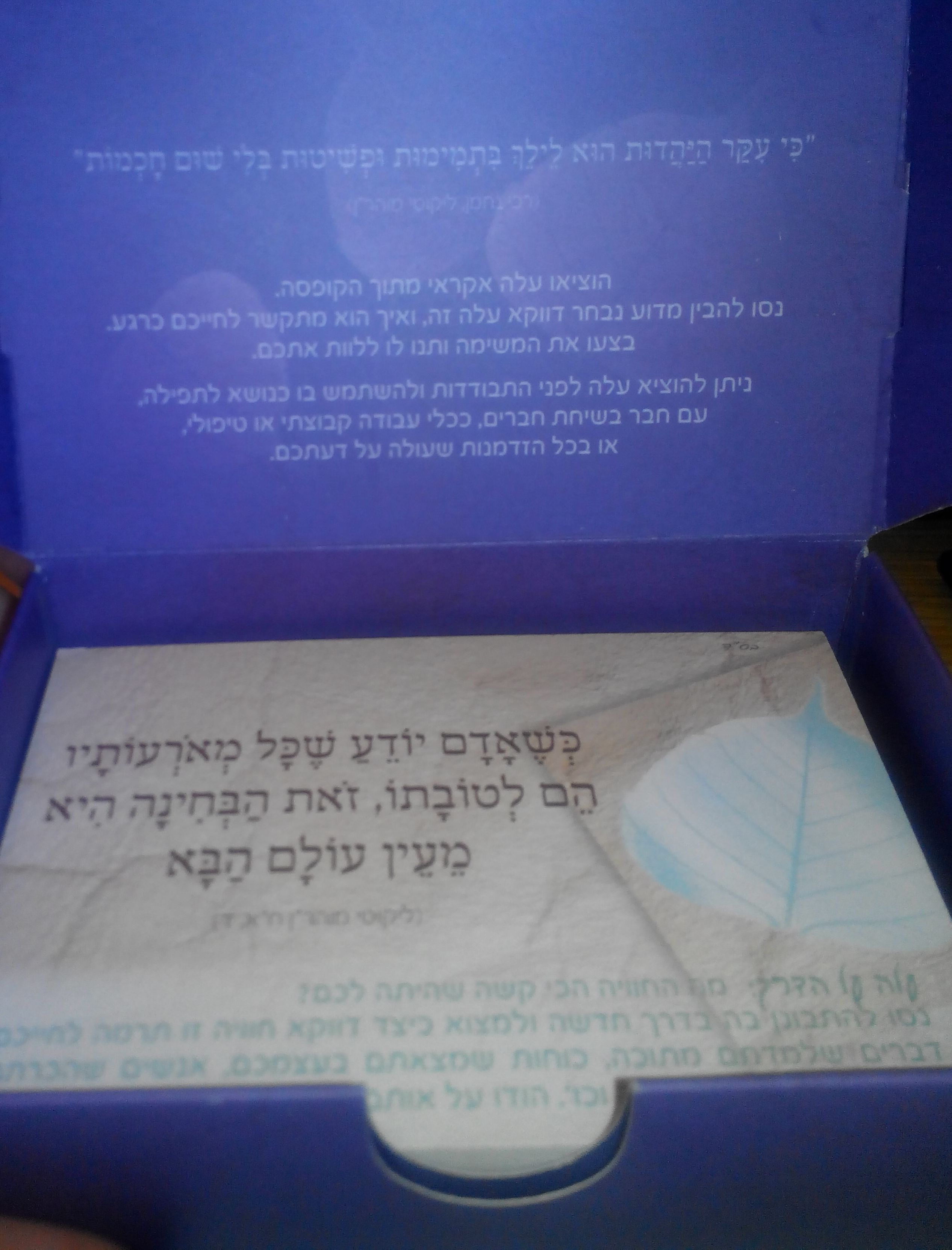 זה הקלף ששלפתי מתוך קופסת 'עלי דרך לניגון הלב' כשמתחת לציטוט מליקוטי מוהר"ן עלו השאלות: "האם אתם מאמינים בנסים? ספרו על נס שקרה לכם. מומלץ לרשום בכל יום במחברת את הנסים שקורים לכם".