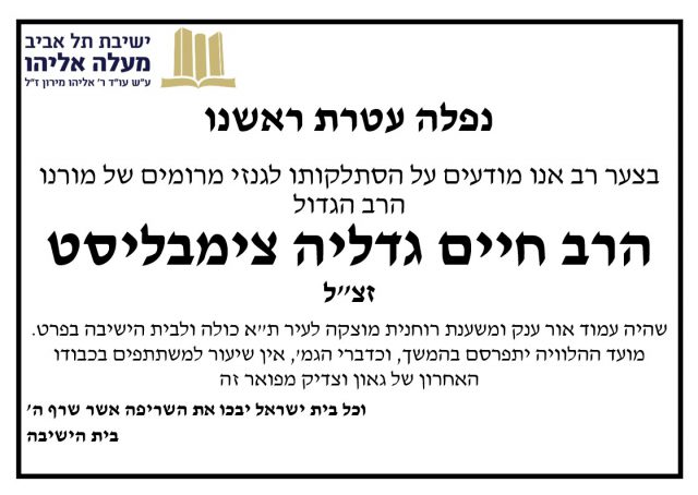 ברוך דיין האמת. הרב צימבליסט מדור הנפילים, מאיר פנים, ענוותן ,איש אשכולות, איש שכולו תורה אמתית, מאישיותו הקרין על כל מדינת ישראל , והעיר ת"א בפרט. אבדה גדולה.