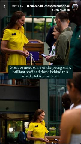 ויליאם וקייט כתבו בעמוד האינסטגרם הרשמי שלהם: "זהו יום יפה למשחק נהדר! ברכות לשני השחקנים אבל גם לגיבורים שמאחורי הקלעים שהופכים את הטורניר הזה למה שהוא. ווימבלדון אתם מסבים לנו גאווה בכל שנה ושנה!"