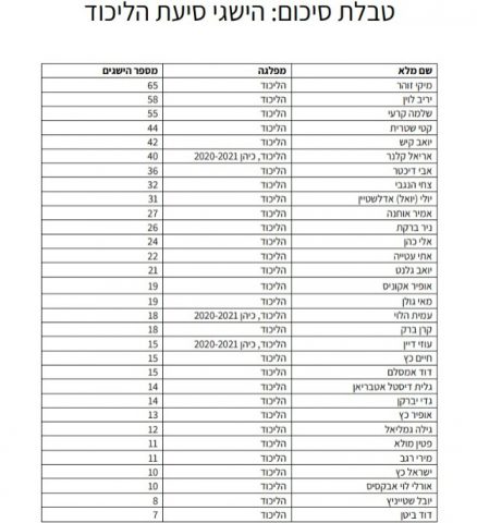 לפי הדו"ח, שמתפרסם כאן לראשונה, במקום הראשון מגיע ח"כ מיקי זוהר עם 65 הישגים.