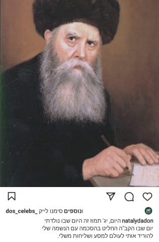נטלי דדון חוגגת יום הולדת, אבל באופן מפתיע, היא ציינה בפיד שלה את החגיגות עם תמונתו של הרי"צ, רבי יוסף יצחק, האדמור הקודם של חסידות חב"ד.