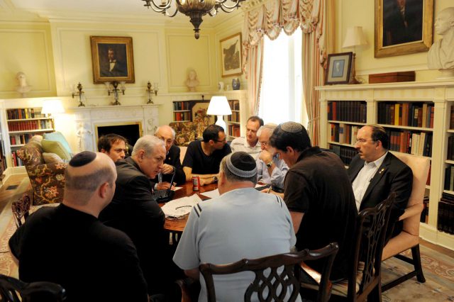 ומה היה לפני? נתניהו תמיד הקיף את עצמו בסרוגים. בתמונה מלפני 11 שנה בחדר האורחים סמוך לבית הלבן נראה נתניהו עם יועציו לפני פגישה עם הנשיא אובמה.