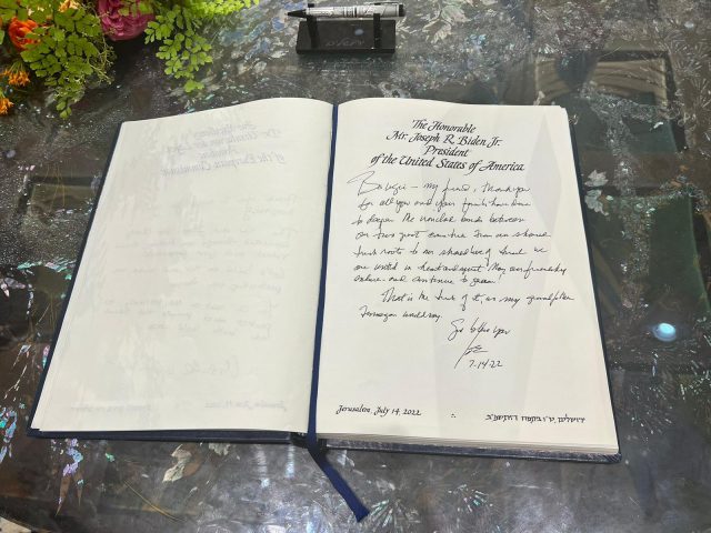 בספר האורחים ביידן כתב: "בוז'י ידידי, תודה על כל מה שאתה ומשפחתך עשיתם למען העמקת הקשר האיתן בין שתי מדינותינו הגדולות. משורשינו האירים המשותפים לאהבתנו המשותפת לישראל, אני מאוחדים בלב וברוח. מי ייתן וידידותנו תימשך ותמשיך לצמוח! זה הקטע האירי בכל הסיפור, כפי שסבי פינגן נהג לומר. אלוהים יברך אותך".