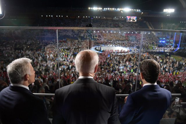 לפני הטקס הרשמי, הקהל שמילא את הדשא הענק קיבל בתרועות את חברי המשלחות מכל העולם שנכנסו אחת אחרי השנייה, עם דגלים, מדים אחידים צבעוניים ומוזיקה ללא הפסקה. אחד הרגעים המרגשים נרשמו עם כניסתה של המשלחת האוקראינית, שזכתה לחיבוק חם ואהדה עצומה מהקהל. אחרי שנים של קורונה, סגרים ואי וודאות, ההתרגשות הייתה אדירה והמפגש האנושי של אלפים מרחבי העולם, הייתה יוצאת דופן.