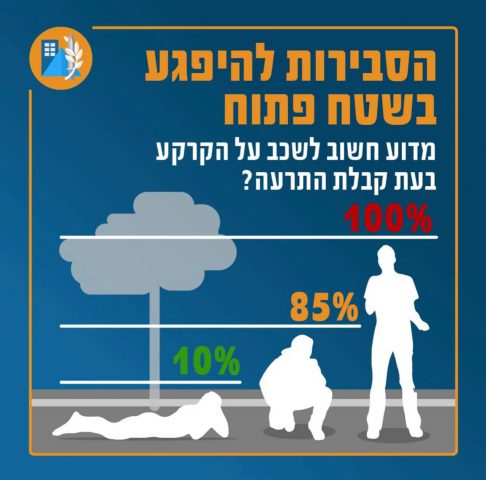 בפיקוד העורך מבקשים להדגיש: "חשוב לדעת כי בכל מקום יש דרך התגוננות ע"פ "הכי מוגן שיש". במקרה שמתקבלת התרעה בשטח פתוח ונמצאים רחוק מהמבנה המוגן יש לשכב על הקרקע ולהגן על הראש באמצעות הידיים, ככל שתהיו קרובים יותר לקרקע, כך הסיכוי שתיפגעו מרסיסים נמוך יותר, לכן, יש לשכב על הקרקע ולהגן על הראש עם הידיים עשר דקות – לא פחות" מדגישים בפיקוד העורף.
