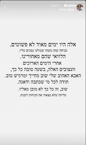 כך היא כתבה: "אלה היו ימים מאוד לא פשוטים. מניחה שזה משהו שכולם נסכים עליו. הלוואי שהם מאחורינו. אחרי הימים הארוכים העצובים האלה, בשעה טובה כל כך, האבא האהוב שלי שוב מחייך ומרגיש טוב".