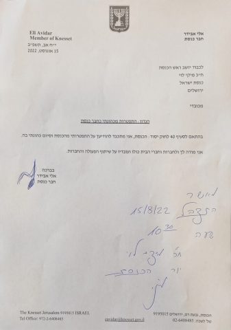 ח"כ אלי אבידר (ישראל ביתנו) הגיש היום (ב') את מכתב ההתפטרות שלו מהכנסת לידי יו"ר הכנסת מיקי לוי. עם התפטרותו תחזור לכנסת שרון רופא אופיר, שהייתה נורבגית בקדנציה הנוכחית ונפלטה עקב התפטרותו של אבידר מהממשלה.
