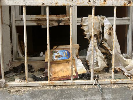 בית כנסת שרוף בלוד בזמן הפרעות. ארכיון (ללא קרדיט)