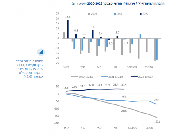 מתחילת השנה נמדד עודף תקציבי של 33.4 מיליארדי שקלים למול גירעון תקציבי בתקופה המקבילה אשתקד אז המדינה הייתה בגירעון של 45.6 מיליארד שקלים.