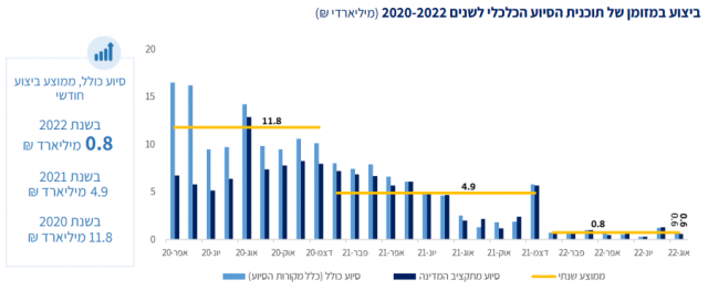 ביצוע במזומן של תוכנית הסיוע הכלכלי לשנים 2020-2022 מראה כי בשנת 2022 עמד הסיוע הכולל על סך 0.8 מיליארד שקלים בלבד לעומת שנת 2021 ועמד סך על של 4.9 מיליארד שקלים ולעומת שנת 2020 ובו עמד הסיוע על סך 11.8.