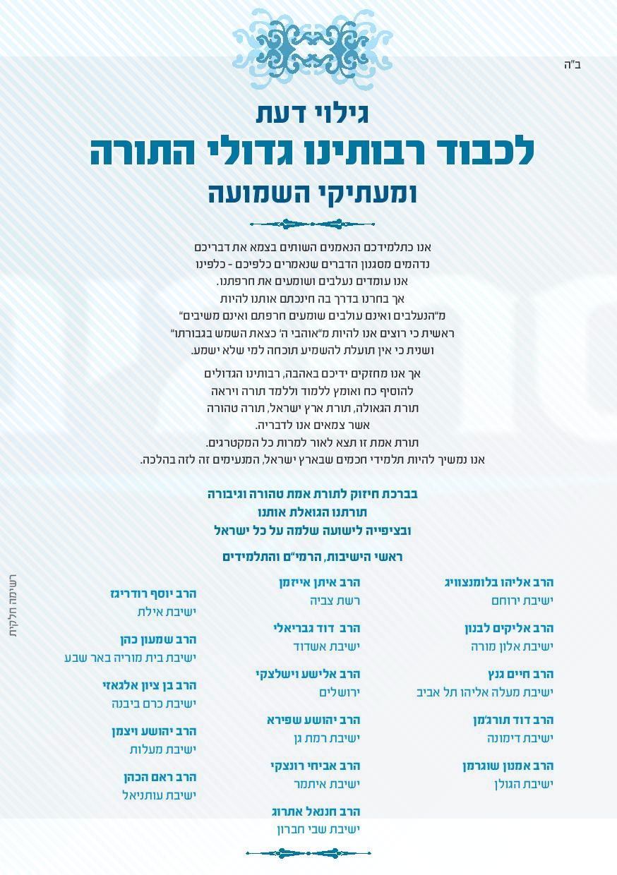 עוד הוסיפו הרבנים: "אנו מחזקים ידיכם באהבה, רבותינו הגדולים להוסיף כוח ואומץ ללמוד וללמד תורה ויראה תורת הגאולה, תורת ארץ ישראל, תורה טהורה אשר צמאים אנו לדבריה. תורת אמת זו תצא לאור למרות כל המקטרגים. אנו נמשיך להיות תלמידי חכמים שבארץ ישראל, המנעימים זה לזה בהלכה. בברכת חיזוק לתורת אמת טהורה וגיבורה תורתנו הגואלת אותנו ובציפייה לישועה שלמה על כל ישראל".