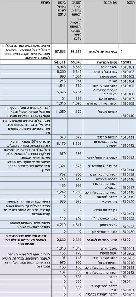 מתוך הסכום הזה, כ-55 מיליון שקלים הוקצו להוצאות בית הנשיא ולשכת נשיא המדינה, ועוד כשני מיליון שקלים לנושאים הקשורים לנשיאי המדינה בעבר. ההוצאות בשנה שעברה ירדו ב-8% המהווים כ-5 מיליון שקלים לאחר שבשנת 2012 הוציא בית הנשיא סכום בלתי נתפס של 62 מיליון בשנה ו-55 מיליון ב-2011.