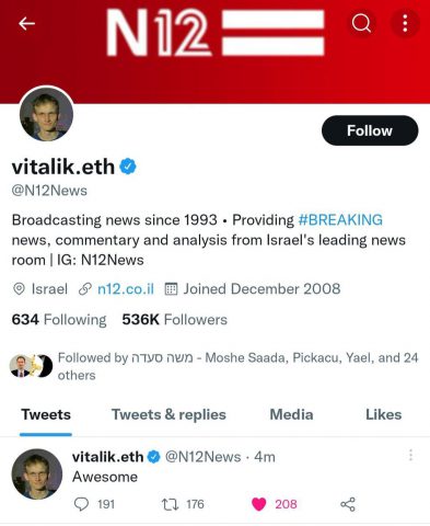 כזכור, אמש חשבון הטוויטר של חברת החדשות נפרץ מעט אחרי השעה 23:00 בלילה, בזמן שכתבי החברה עוד דיווחו על הדרמה בכנסת סביב סגירת הרשימות לבחירות. תוך זמן קצר שם החשבון הוחלף ל"Vitalik.eth", ותמונת הפרופיל הוחלפה לתמונה של מהנדס התכנה הרוסי ויטלי בוטרין, מי שהקים את יישום הבלוקצ'יין "את'ריום" המשמש לכריית מטבעות דיגיטליים.