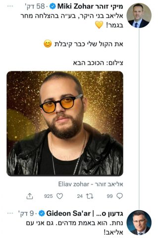לקראת הגמר של "הכוכב הבא" שייערך מחר (שלישי), בו לוקח חלק אליאב זוהר, בנו של הח"כ מיקי זוהר (הליכוד), צייץ האחרון ברכה לבנו: "אליאב בני היקר, בע״ה בהצלחה מחר בגמר! את הקול שלי כבר קיבלת".