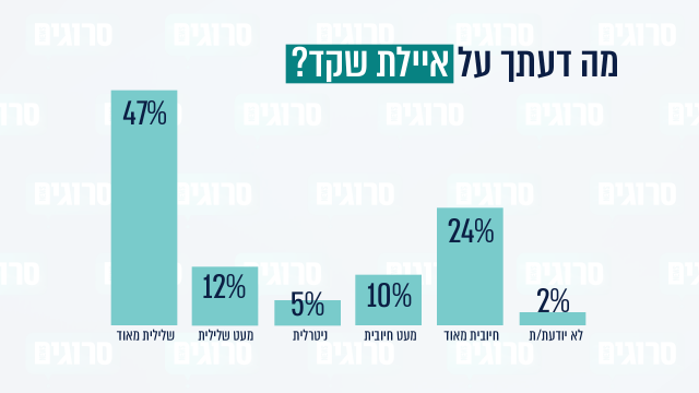 לשאלה מה דעתך על איילת שקד? 47% ענו כי דעתם שלילית מאוד, 24% ענו חיובית מאוד, 12% ענו מעט שלילית, 10% ענו חיובית מאוד, ו-5% בעלי דעה ניטרלית לגבי איילת שקד.