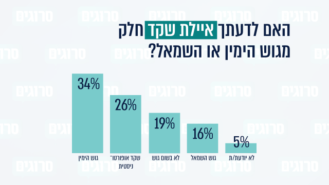המשתתפים נשאלו אם לדעתם איילת שקד היא חלק מגוש הימין או מגוש השמאל. 34% ענו מגוש הימין – עלייה ביחס לסקר אוגוסט, אז 27% מהציונות הדתית ראו בה חלק מגוש הימין. במקביל, 16% רואים בה כיום חלק מגוש השמאל, ירידה בהשוואה לאוגוסט, אז 23% ראו בה חלק מגוש השמאל.
