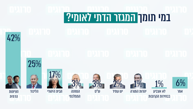 הליכוד שקיבלה בסקר קודם 29% מקולות המגזר, רושמת ירידה ומקבלת כעת 25% מקולות המגזר הדתי לאומי. הציונות הדתית של איתמר בן גביר ובצלאל סמוטריץ' מתחזקת מעט, ולאחר שבאוגוסט זכתה ל-38% מקולות המגזר, כעת עומדת על 42% ממנו.