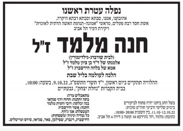 אשת תנועת 'אמונה' חנה מלמד, נפטרה בסוף השבוע האחרון. הלווייתה תיערך הבוקר בשעה 10:00 בבית העלמין 'נחלת יצחק' בגבעתיים. מלמד ז"ל הותירה אחריה ילדים, נכדים ונינים.