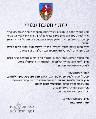 אליעד מואטי, מח"ט חטיבת גבעתי, שלח הערב (רביעי) מכתב מרגש ללוחמי הפלוגה, בה התייחס לנפילתו של עידו ברוך ז"ל.