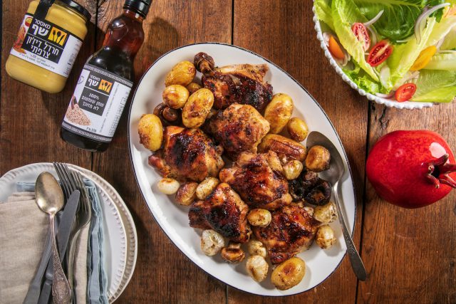 מתכון לקדירת עוף בסויה בשילוב דבש, חרדל, תפו״א ופטריות.