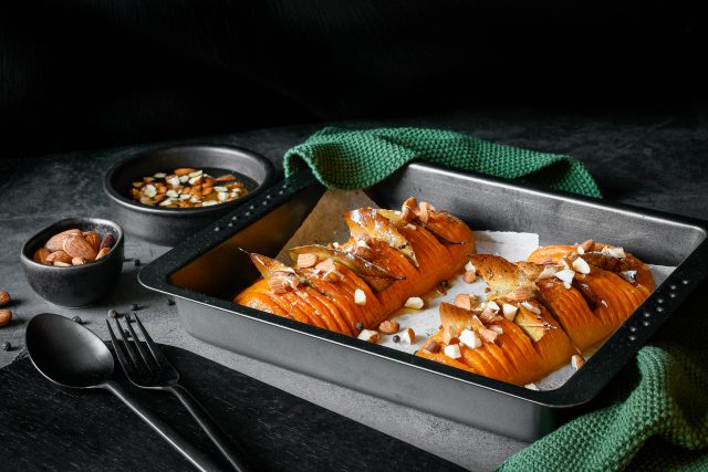 קולפים את הדלורית וחוצים לשניים. בעזרת סכין חדה וגדולה חותכים את חצי הדלורית עד לחצי הגובה בחתכים דקים ומניחים אותם על תבנית תנור מרופדת בנייר אפיה.