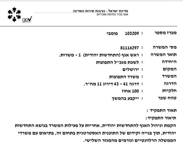 בפרטי המכרז נכתב בין השאר כי המועמד אחראי על "הקמת וניהול האגף להתחדשות יהודית, אחריות על פעילות המשרד בנושא התחדשות יהודית, תוך בנייה וקידום של התוכנית האסטרטגית בתחום זה, בתיאום עם משרדי הממשלה הרלוונטיים וגורמים מהמגזר השלישי. ייזום, הובלה וניהול פרויקטים בתחום ההתחדשות היהודית בארץ ובעולם, ניהול תקציב הפרויקטים, קביעת לוחות זמנים וביצוע מעקב ובקרה על התקדמות הפרויקטים ואיכותם" ועוד ועד.