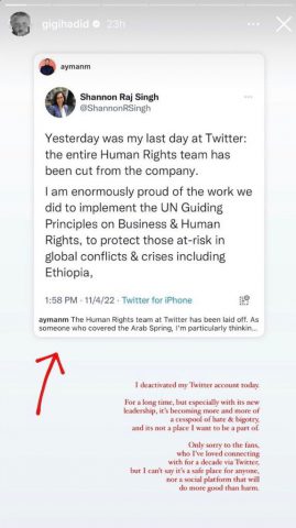 כך כתבה חדיד: "ביטלתי את חשבון הטוויטר שלי היום. במשך זמן רב, אבל במיוחד עם המנהיגות החדשה שלו, המקום הופך יותר ויותר לביוב של שנאה וקנאות, וזה לא מקום שאני רוצה להיות חלק ממנו".