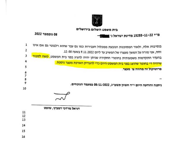 התושב נעצר אתמול, ונחקר בגין מספר אירועי מחאה ברחבי יו"ש כנגד הטרור הערבי המשתולל. היום דחה השופט דניאל מרדכי דמביץ את בקשת ימ"ר ש"י לעצור את התושב ל-4 ימים, והאריך ב-24 שעות בלבד, תוך שהוא מציין בהחלטה כי התושב ככל הנראה ישוחרר מחר וכי "קשה לסבור שיהיה די בחומר שהוצג בכדי להצדיק הארכת מעצר נוספת". כאמור מיד לאחר הדיון הוצא כנגד התושב צו מעצר מנהלי החתום בידי שר הביטחון בני גנץ. בדיון ייצג את העצור עו"ד אסף גונן מטעם ארגון חוננו.