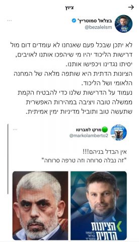לאור המתיחות הגואה בין יו"ר הציונות הדתית בצלאל סמוטריץ' לראש הממשלה המיועד בנימין נתניהו, אשר עלתה בימים האחרונים בעיקר סביב המחלוקת על תיק הביטחון, אותו סמוטריץ' דורש לקבל, צייץ הערב (ראשון) אחד מפעילי הליכוד תמונה של סמוטריץ' לצד לא אחר מיחיא סנוואר וכתב: "זה נבלה סרוחה וזה טרפה סרוחה".