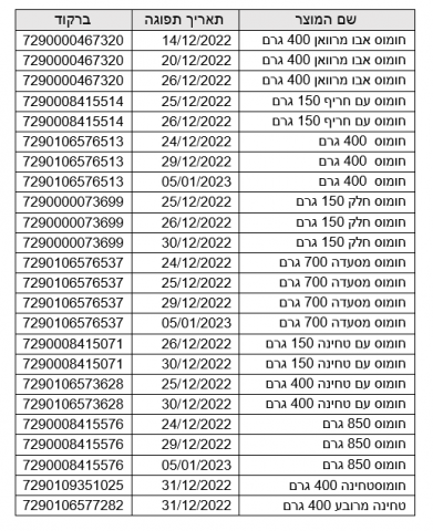 להלן פירוט מלא של המוצרים עליהם הוכרז ריקול וכן תאריך התפוגה והברקוד של כל אחד מהם: