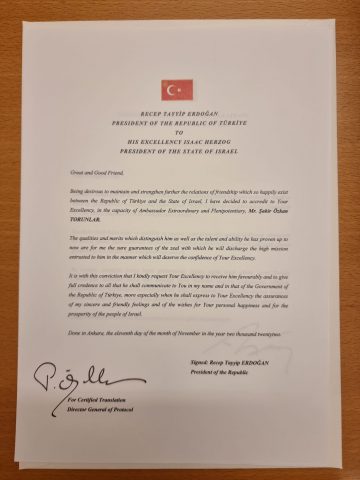 בקרוב צפוי להגיש השגריר הטורקי המיועד גם את כתב האמנתו לנשיא הרצוג, אז ייכנס מינויו לתוקף רשמית.