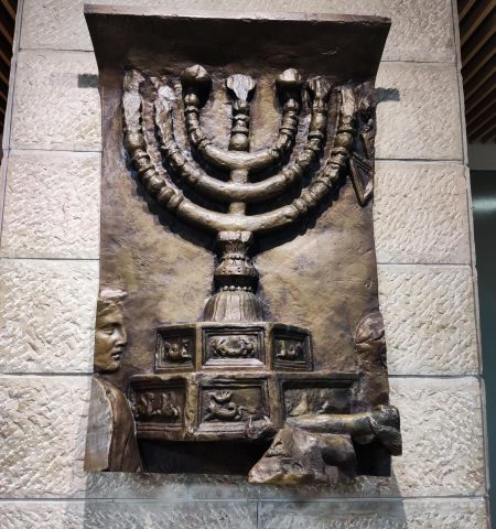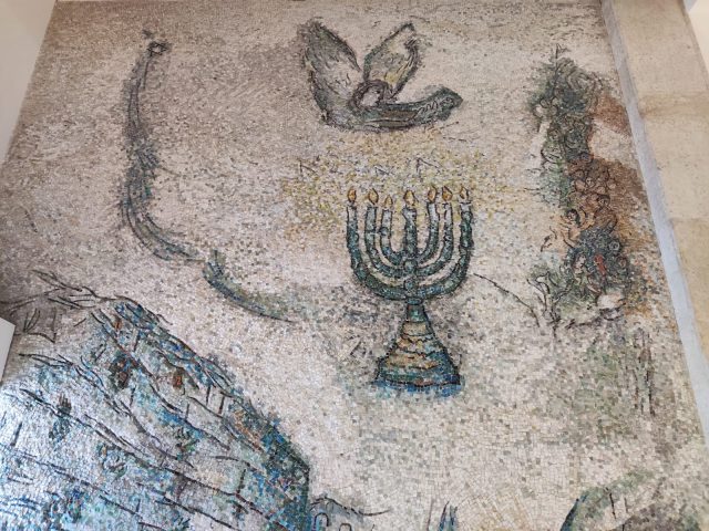 על שטיחי הקיר המכונים "גובלנים", המנורה מופיעה פעמיים, וכן על מרכז קיר הפסיפס הייחודי הוא מופיע גם, כאשר סביב הנרות משובצים זכוכית שמייצרות אפקט של אורות מנצנצים.