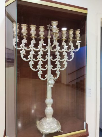 חנוכייה כסף שנתרמה למשכן הכנסת מתנת משפחת "הצורפים" – יוסף צדוק ובניו בשנת 1985, ובו נעשה שימוש באירועי חנוכה שנערכים לעיתים בכנסת