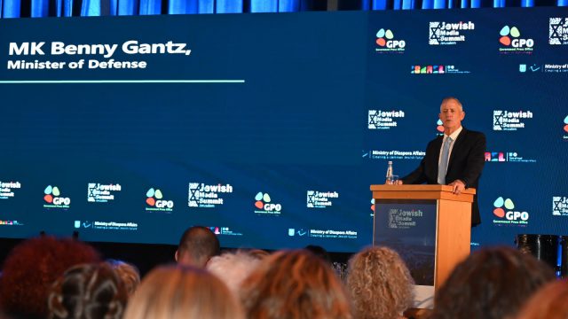 שר הביטחון ויו"ר המחנה הממלכתי בני גנץ נאם הערב (שני), בפתח הוועידה השנתית שמארגנת לשכת העיתונות הממשלתית – Jewish Media Summit, בפני מעל 100 עיתונאים מהתקשורת היהודית מרחבי העולם.