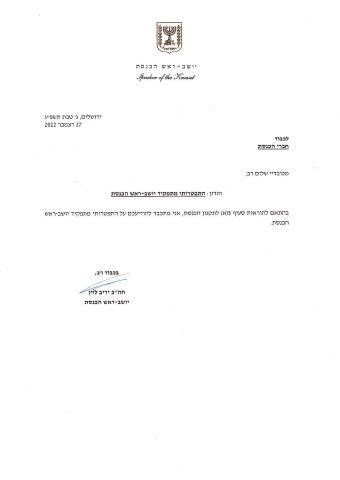 יו"ר הכנסת יריב לוין הגיש כעת מכתב התפטרות מתפקידו כיו"ר הכנסת. מדובר בצעד שנועד להכשיר אותו להיות חבר בממשלה.