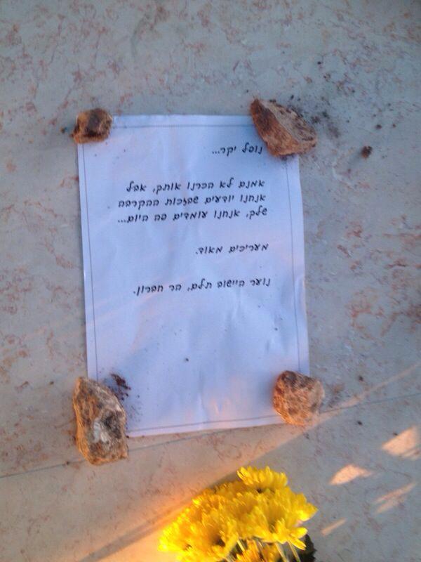 במכתב נכתב: " נופל יקר, אנחנו לא הכרנו אותך אבל אנחנו יודעים שבזכות ההקרבה שלך, אנחנו עומדים פה היום. מעריכים מאוד, נוער הישוב תלם, הר חברון".