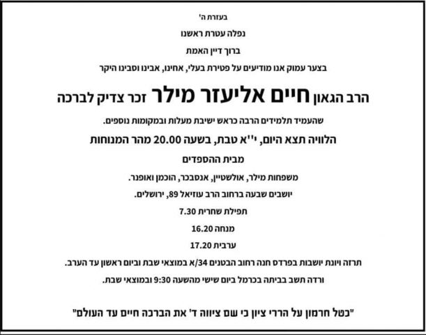 הרב מילר זצ"ל ייטמן בהר המנוחות, והלווייתו תצא הערב (ד') בשעה 20:00.