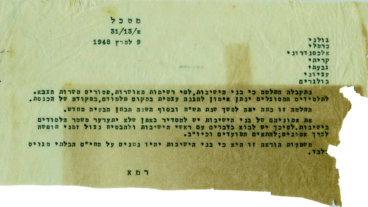 מסמך הפקודה, המתוארך ל-9 במרץ, נכתב ונחתם על ידי ישראל גלילי ז"ל, אז ראש המפקדה הארצית (רמ"א) של ה'הגנה', ולימים חבר כנסת ושר בממשלות ישראל, ונשלח לכל חטיבות צה"ל שבדרך: "גולני, כרמלי, אלכסנדרוני, קריתי, גבעתי, עציוני ו"בולגרים" [כינוי לפלמ"ח]". גלילי, אשר שימש אז בתפקיד המקביל לרמטכ"ל קיבל את ההוראה על הענקת הפטור מגיוס לבני הישיבות מדוד בן גוריון, שלושה ימים לפני שהאחרון מונה ליו"ר מועצת העם, המוסד העליון של היישוב שהוקם לקראת ההכרזה על הקמת המדינה כחודשיים אחר כך.