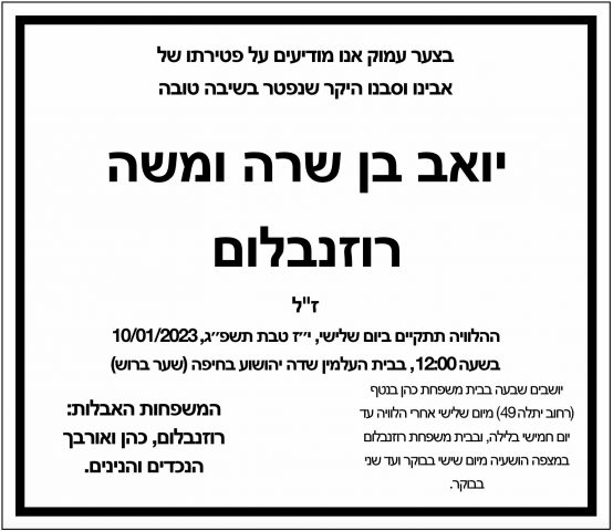 הלווייתו של יואב רוזנבלום ז"ל, תתקיים מחר (ג') בבית העלמין בשדה יהושע בחיפה.