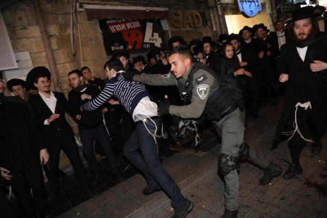 בעוד שבמוצאי שבת הכילה המשטרה את חסימות הכבישים בתל אביב של המפגינים נגד הממשלה. הערב (א') בירושלים המשטרה גילתה פחות סובלנות ופיזרה בכוח מפגינים חרדים שחסמו כביש במאה שערים, כולל שימוש בפרשים.