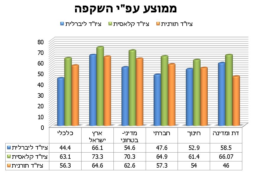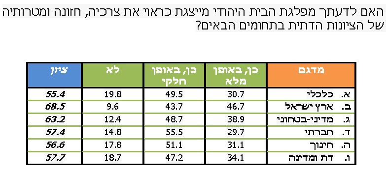 בפילוח לפי חלוקה בתוך המגזר, נראה כי בקרב המגזר הליברלי מקבלת הבית היהודי את ציונים נמוכים כמעט בכל פרמטר כשהתחום הכלכלי-חברתי זוכה לביקורת החזקה ביותר. אצל התורניים, מקבלת המפלגה את הציון נכשל בנושאי חינוך ודת ומדינה ועוברת בקושי בנושא הכלכלי אך זוכה לציון עובר בנושאים מדיניים. בקרב הציונות הדתי הקלאסית הציונים גבוהים במיוחד בכל הנושאים.